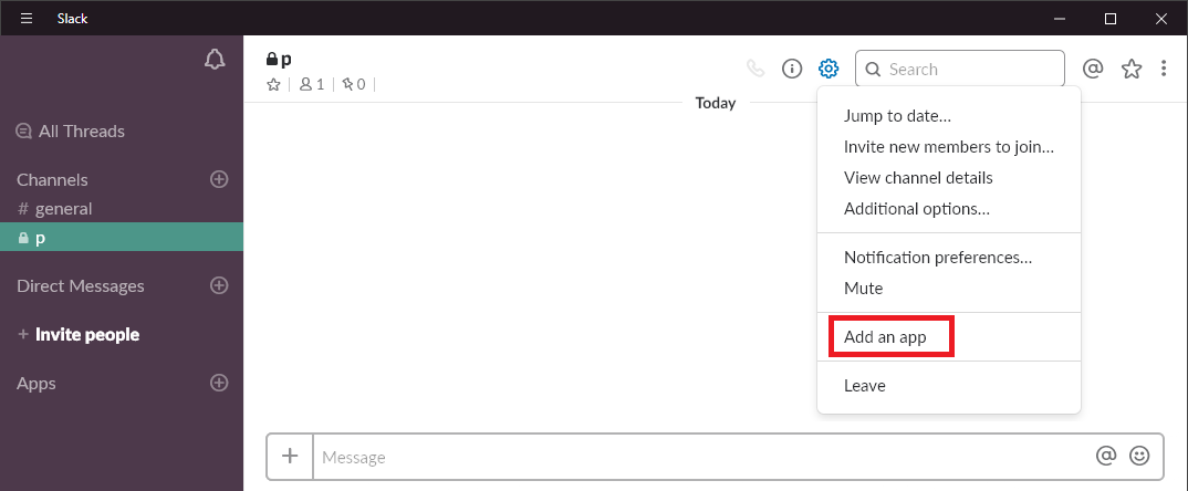 Slack에서 채널을 만든 후 “Add an app”을 클릭한다.